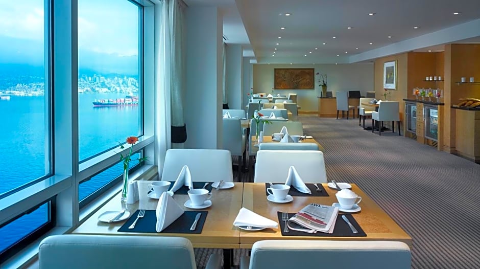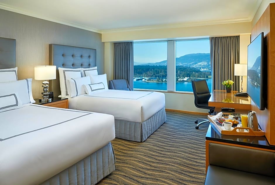 This spacious room offers a 42" LCD TV, iPod dock, fully stocked mini-bar, coffee maker, and a digital safe. A seating area and work desk are provided. The private bathroom includes Italian marble and free toiletries. A view of the Vancouver harbor and coastal mountains is enjoyed.